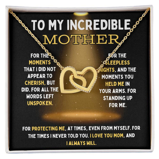 To My Incredible Mother Interlocking Hearts Necklace (Choose Standard Black Box or Mahogany Box With LED Light)